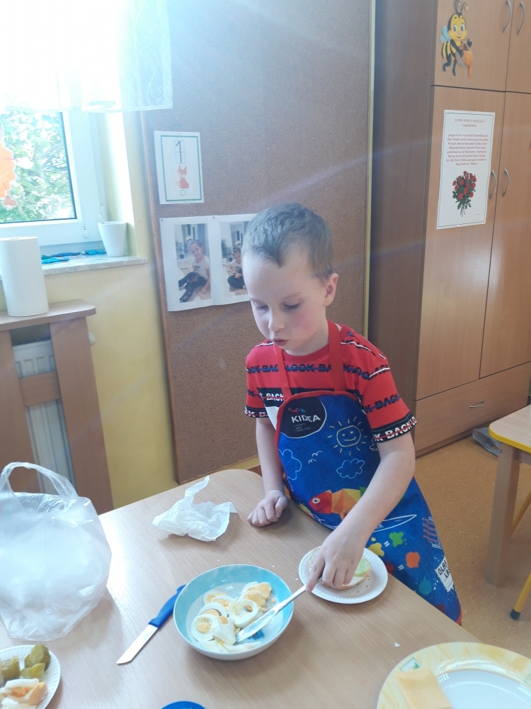 Po umyciu rąk oraz warzyw dzieci przystąpiły do przygotowania kanapek. Samodzielnie smarowały pieczywo masłem, kroiły warzywa oraz układały dowolnie przez siebie wybrane witaminy. Wszystkie dzieci z wielkim apetytem zajadały przygotowane przez siebie kanapki.